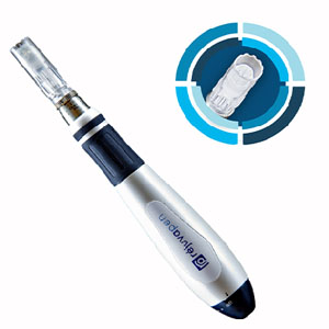 The microneedling device is built with a wheel of tiny needles at the tip. As the needles penetrate the outer layer of skin, it stimulates growth factors and the growth of collagen, the scaffolding under the skin, which then improves the overall texture, elasticity, and complexion of the skin.